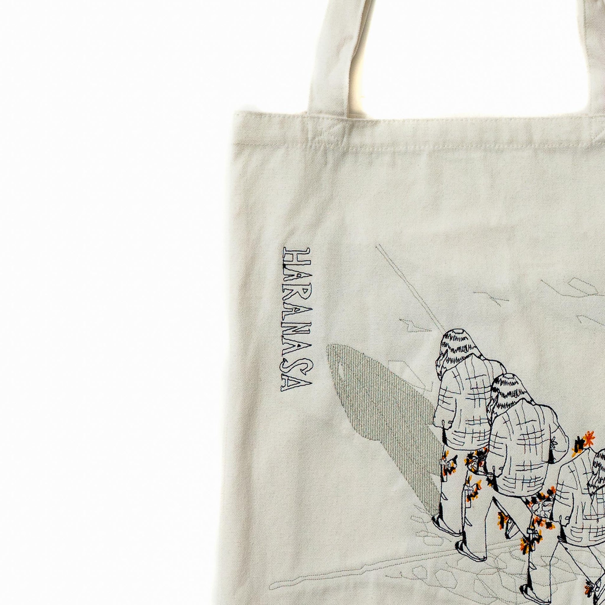 Bring a touch of storytelling to your everyday carry with the Haranasa Embroidered Tote Bag. This minimalist yet eye-catching tote features an intricate embroidered design of three figures in motion, adorned with bursts of orange floral accents. The artwork—detailed and whimsical—evokes a sense of movement and quiet rebellion, all shadowed by a subtle silhouette in the background.